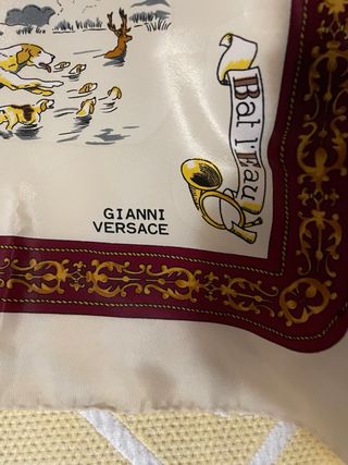 Elegante pañuelo de seda de la marca Versace. Presenta un diseño detallado con escenas de caza y motivos ecuestres. - Pañuelo de seda. - Diseño de caza. - Colores: beige y rojo.