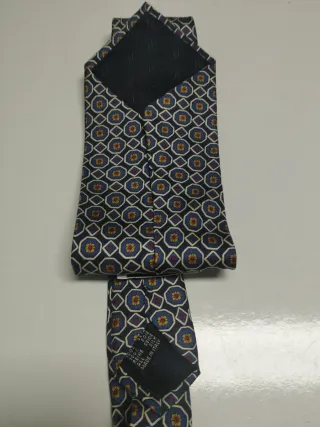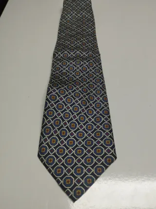 Elegante corbata de seda con un diseño geométrico en tonos azules y detalles florales. - Fabricada en 100% seda. - Patrón de rombos y flores en azul, amarillo y rojo.