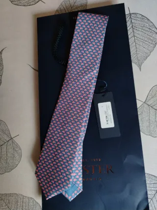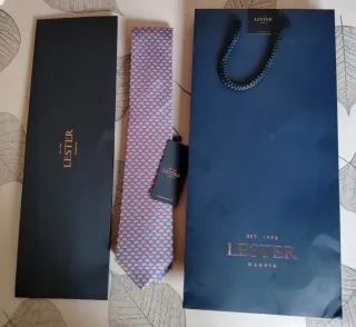 Corbata de la marca LESTER con un diseño llamativo. - Patrón de peces en color rosa. - Fondo azul marino. - Material 100% seda. -Talla 8 -Nueva con etiqueta. - Funda de la corbata y bolsa incluida. Ideal para regalo al llevar su etiqueta y las bolsas.