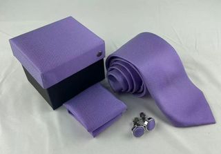 Elegante conjunto de corbata y gemelos a juego, presentado en una caja. - Corbata de color morado con textura. - Gemelos a juego con detalles plateados. - Caja de presentación incluida.