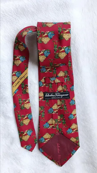 Elegante corbata de seda con un diseño estampado único. - Estampado de sellos postales con diversas ilustraciones. - Base de color amarillo pálido. - Detalle de borde festoneado en los sellos. -Tiene una pequeña mañcha ,un puntito.