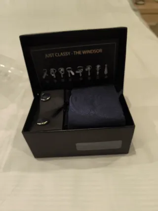 Caja regalo corbata, gemelos, pañuelo y alfiler