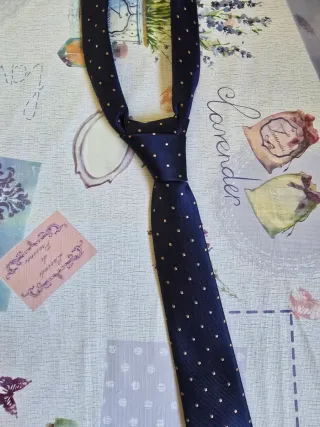Corbata de H&M con un diseño clásico de lunares. - Color azul marino. - Pequeños lunares en tono claro. Mide 72 cm (largo), nueva, sin usar.