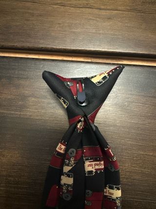 Conjunto de corbatas de diferentes diseños y texturas. - Corbata con estampado de autobuses rojos. - Corbata de imitación piel negra. - Variedad de corbatas con distintos estampados y tejidos.