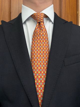Elegante corbata de seda con un diseño llamativo. - Patrón geométrico en tonos rojos, amarillos y azules. - Tejido de seda de alta calidad.
