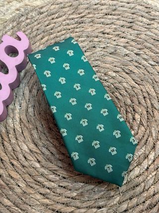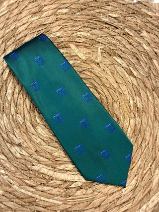 Elegante corbata con un diseño distintivo. - Color verde vibrante. - Patrón de mesas de feria en azul. - Tejido de alta calidad.