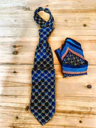 Elegante conjunto de corbata y pañuelo de seda. - Fabricado en 100% seda. - Diseño con motivos dorados y de colores sobre fondo azul.