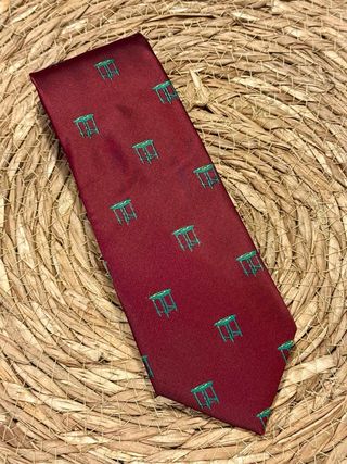 Elegante corbata de color burdeos con un discreto estampado de mesas en verde. - Diseño jacquard. - Tejido de seda. - Ideal para ocasiones especiales.