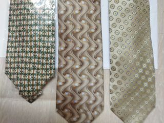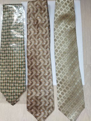 Conjunto de tres corbatas de seda, nuevas y sin usar. - Diseño con motivos geométricos. - Tejido de seda de alta calidad. - Colores variados, incluyendo tonos dorados y verdes. Cada una 3€ . Lote de 3 x 6€