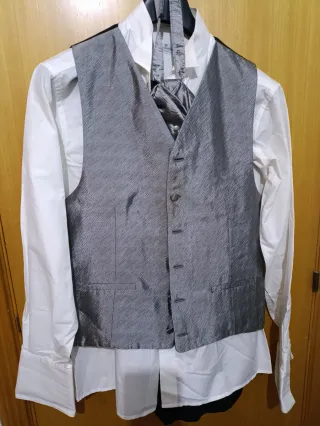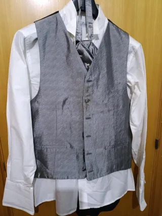 Conjunto de traje para novio o eventos especiales, compuesto por camisa, chaleco y corbata. Medidas chaqueta : 47 cm hombro y 74 cm de largo. Medidas pantalón : 44 cm cintura y 104 cm de largo. La camisa es talla 50-52. - Chaleco con diseño texturizado. - Corbata a juego con el chaleco. - Camisa de manga larga.