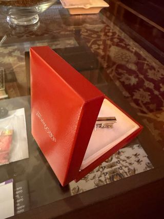 Elegante conjunto de gemelos y pasador de corbata. - Diseño moderno con detalles en rojo y plateado. - Incluye caja para guardarlo.