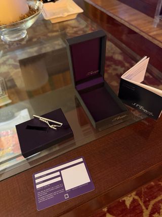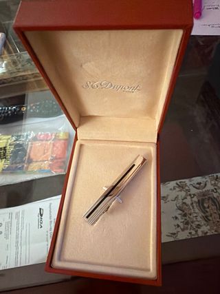 Elegante pisacorbatas de la prestigiosa marca S.T. Dupont. - Diseño sofisticado en tonos plateados y dorados. - Acabado metálico de alta calidad.