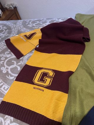Bufanda de Gryffindor, inspirada en Harry Potter. Perfecta para fans. - Diseño a rayas en color burdeos y amarillo. - Detalle de la letra 'G' bordada. - Nombre 'Gryffindor' en la parte inferior.