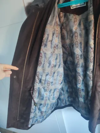 Elegante chaquetón de piel para mujer con capucha que se quita mediante cremallera. - Color marrón chocolate. - Diseño con forro estampado. - Detalle de pelo en capucha. - Botón de repuesto en bolsillo