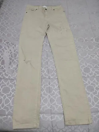Pantalón de niño en color beige con un diseño moderno y desgastado. - Cintura con cierre de botón y cremallera. - Bolsillos delanteros y traseros. - Detalle de rotos en rodillas y muslos.