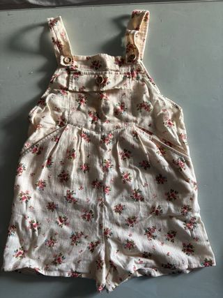 Mono corto de lino para niña con estampado floral. - Tirantes con botones. - Bolsillos delanteros. - Cintura elástica.