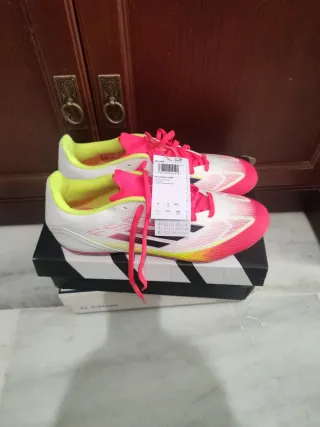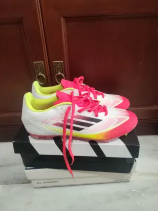 Zapatillas de fútbol Adidas F50 League. - Diseño en blanco y rosa vibrante. - Suela con tacos para césped. - Detalle de franjas en amarillo y rosa.