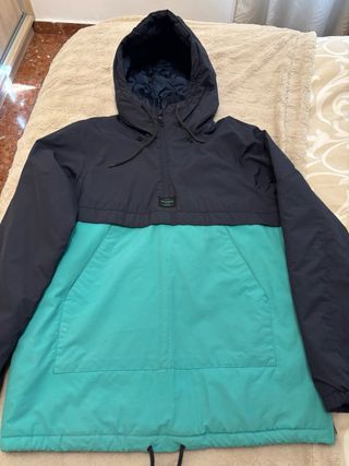 Chaqueta de estilo anorak con capucha. - Diseño bicolor en azul marino y turquesa. - Bolsillo frontal tipo canguro. - Cierre de cremallera parcial en el cuello. - Cordones ajustables en la capucha y el bajo. - cremallera lateral