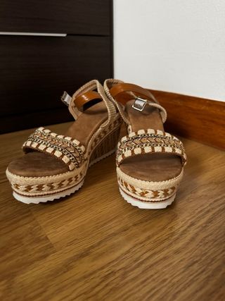 Sandalias cuña beige y marrón