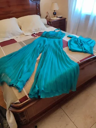 Elegante mono de ceremonia, usado una sola vez. - Diseño con escote halter. - Cuerpo plisado. - Cintura marcada. - Pantalón ancho plisado. - Detalle de pedrería en el cuello. - Incluye accesorio para el pelo a juego.