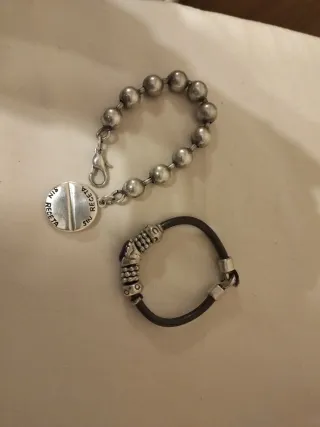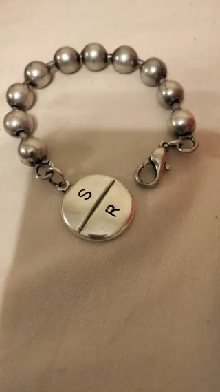 10€ cada una. Pulsera con un charm en forma de pastilla dividida, con las iniciales S y R grabadas. El cierre es de tipo langosta. - Largo: 18 cm - Cierre de langosta Pulsera de cuero con piedra morada -18 cm