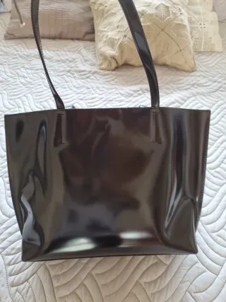 Bolso de mano Bimba y Lola con un acabado brillante. - Color marrón oscuro. - Detalle metálico dorado en la parte frontal.