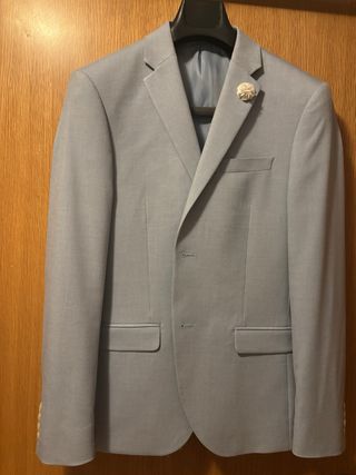 Traje elegante de color azul claro, en excelente estado ya que solo se ha usado en una ocasión. - Solapa de muesca. - Cierre de dos botones. - Bolsillos de solapa. - Pin de solapa floral incluido.