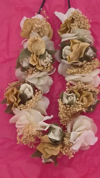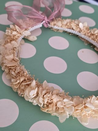 Corona de flores preservadas, ideal para comuniones y ceremonias. - Flores secas en tonos beige y rosa. - Adornada con cinta de tela.Puede cambiarse color cinta por la deseada ,hay hojales que lo permiten
