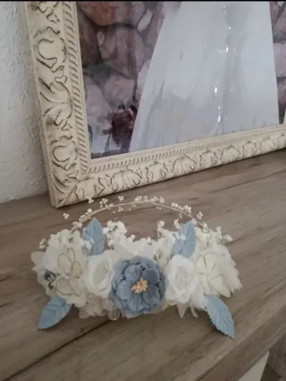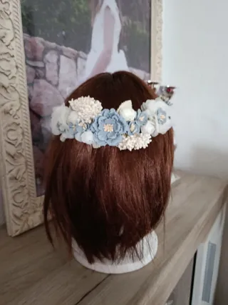 Preciosa corona de flores para comunión o eventos especiales. Un accesorio delicado y elegante. - Elaborada con flores de tela en tonos azules y blancos. - Base de la corona trenzada y decorada. - Detalles de hojas y pequeñas flores.
