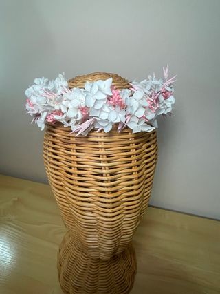 Corona de flores secas, ideal para comuniones o eventos especiales. Elaborada con esmero para un toque delicado. - Flores secas en tonos beige y rosa. - Base flexible y ajustable.