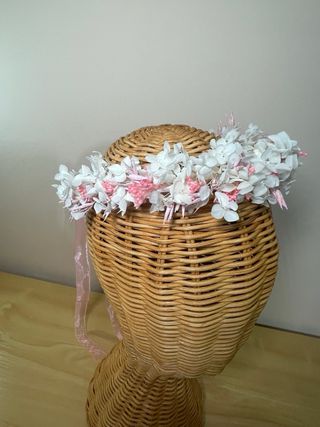 Corona de flores preservadas, ideal para complementar un peinado. - Flores de hortensia blancas. - Detalle de flores pequeñas en color rosa. - Ideal para niñas de comunión.