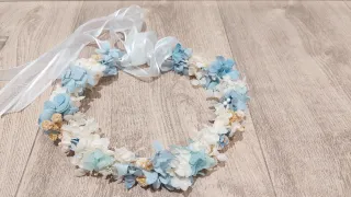 Preciosa corona de flores para comunión, con un diseño delicado y elegante. - Flores en tonos azul algodón y blanco. - Adornada con detalles de tul y cintas blancas y minipaniculata preservada. - Ideal para complementar el atuendo de comunión.