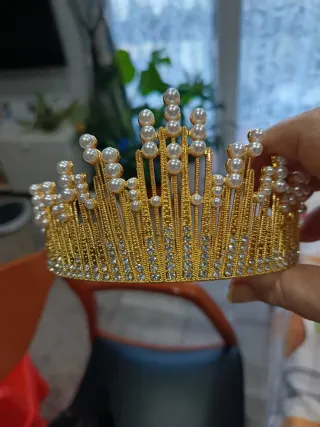 Preciosa corona con un diseño elegante, adornada con perlas y pedrería brillante. - Color dorado. - Ideal para comuniones o novias.