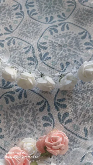 Corona de flores blancas, ideal para celebraciones. - Adornada con pequeñas rosas de tela. - Detalles de encaje y cintas. - Diseño delicado y elegante.