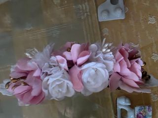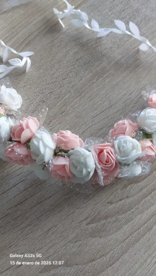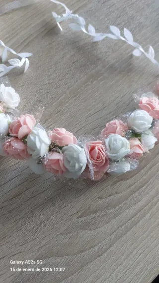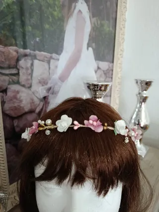 Preciosa corona de flores y perlas, ideal para comuniones o eventos especiales. - Adornada con delicadas flores en tonos rosa y blanco. - Detalles de pequeñas perlas y cuentas doradas. - Diseño floral .