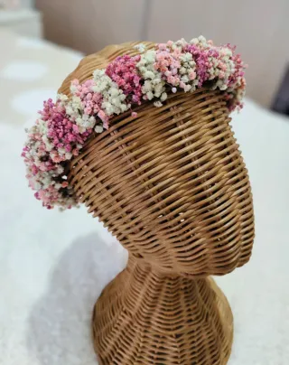 Corona de flores secas, ideal para eventos o decoración. - Flores de paniculata en tonos rosas y blancos. - Diseño delicado y natural. Corona hecha a mano de flores preservadas de paniculata, en tonos rosa empolvado y blanco empolvado. Se ata con lazo en la parte trasera, permitiendo un ajuste cómodo. Ideal para comunión, arras o ceremonias. Nueva, sin uso, muy ligera y delicada.