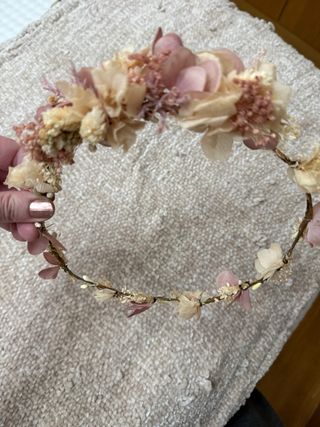 Preciosa corona de flores para comunión, con un diseño delicado y romántico. - Adornada con flores secas y artificiales. - Base de aro forrado en tela. - Detalles en tonos beige y rosa.