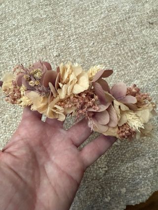 Conjunto de corona y pasador adornados con flores secas y preservadas. - Diseño delicado en tonos beige y rosa. - Ideal para comuniones o eventos especiales. - Hecho a mano con materiales de calidad.