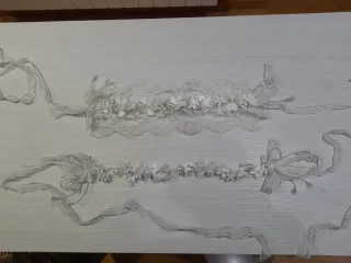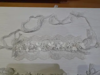 Preciosa corona y cinturón adornada con delicadas flores y perlas. Las dos cosas por 20 euros. - Diseño floral blanco y plateado. - Detalles de encaje y lazos. - Ideal para ocasiones especiales.