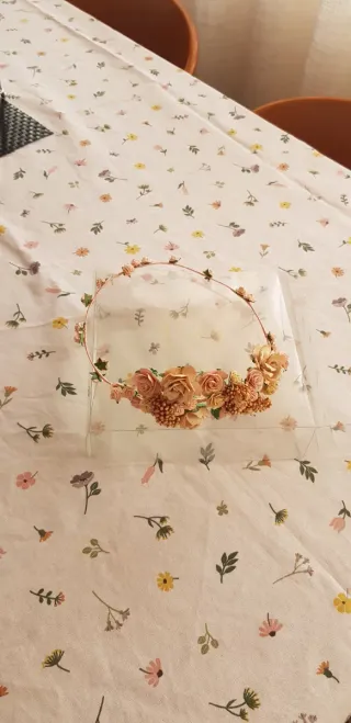 Preciosa corona de flores, ideal para ceremonias o eventos especiales. - Flores en tonos beige y rosa. - Diseño delicado y artesanal.