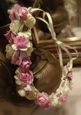 Corona de flores hecha a mano con flores en color rosa, crema y cinta de hojas dorada claro. Es ajustable y sirve tanto para niña como para adulta. Preciosa para boda, comunión y otra fiesta. Las coronas llevan las flores por delante, no las hago enteras.**PRECIO NO NEGOCIABLE**