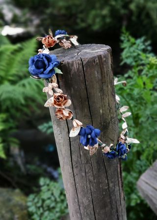 Corona de flores hecha a mano con flores azul marino y cinta de hojas dorada. Preciosa para niña o adulta (es ajustable), para la primera comunión, boda, fiesta hippie o cualquier otro evento. Las coronas llevan las flores por delante, no las hago enteras. NO NEGOCIABLE.