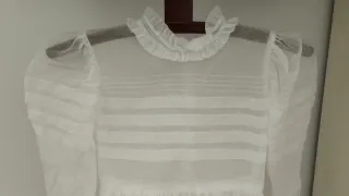 Vestido de comunión blanco con detalles de encaje y volantes. - Tejido ligero y vaporoso. - Mangas abullonadas. - Cuello alto con volantes. - Diseño con varias filas de cintas. Largo total del vestido 120 cms. Sólo le hace falta planchado. Incluye can can y velo con corona de rosas.