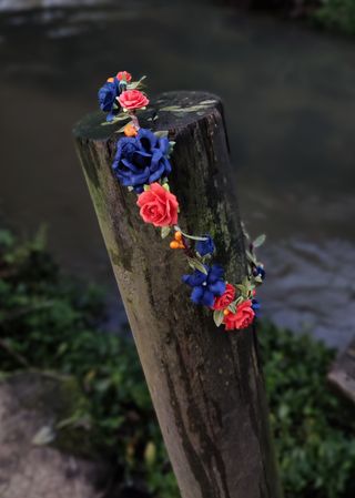 Corona de flores azul marino y naranja