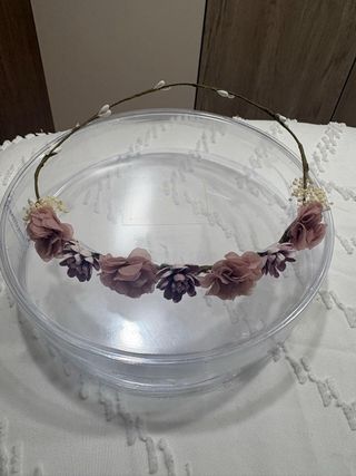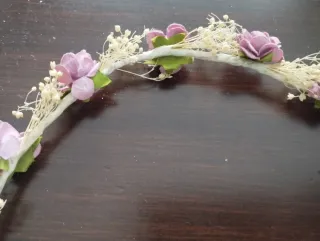 Corona de flores ideal para comuniones o eventos especiales. - Flores de tela en tonos lila y rosa. - Base de alambre forrado. - Adornada con pequeñas hojas y detalles.