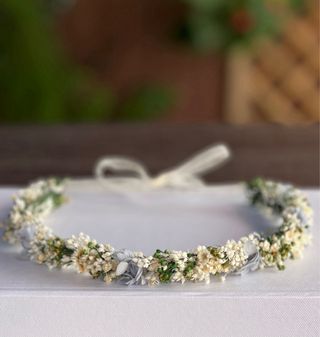Corona de flores de paniculata preservada ideal para comuniones o eventos especiales. - Adornada con pequeñas flores blancas. - Diseño delicado y elegante,se hacen por encargo a medida .