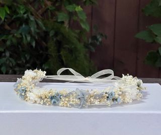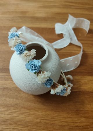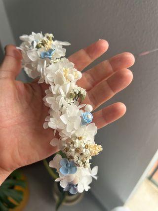 Corona de flores secas, ideal para comuniones o eventos especiales. Un accesorio delicado y natural se hacen por encargo . - Flores secas preservadas. - Diseño circular. - Combinación de tonos azules y blancos.