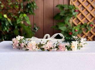 Corona de flores artificiales, ideal para eventos especiales como comuniones o bodas. - Flores de tonos rosas y verdes. - Adornada con cintas de raso rosa. - Base de ramas naturales.Esta sin estrenar porque le venía grande.