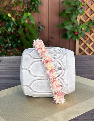 Corona de comunión adornada con flores preservadas en tono rosa empolvado de hortensia y paniculata