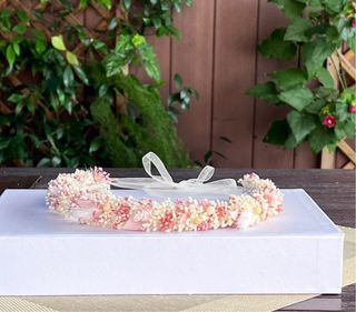 Corona de flores preservadas, ideal para comuniones o eventos especiales. Combina tonos beige y rosados para un look delicado. - Flores secas y preservadas. - Diseño floral artesanal. - Base ajustable.